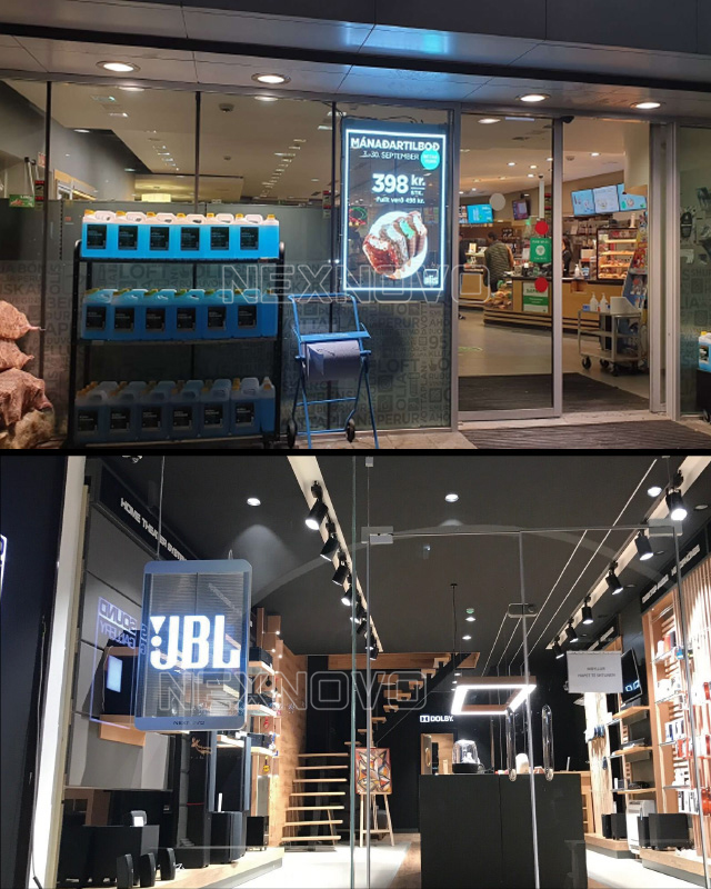 电子海报屏通透度约70%,不影响室内自然采光,与店内设计完美融合。